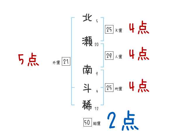 天運![]() | 北瀬南斗稀さんの天運は25画の4つ星!個性があり才能があふれる。強運の持ち主で発展する。 家系が持つ宿命的な運勢を表します。祖先から受け継いだ苗字ですので自分の力が及びません。家柄を象徴します。 |