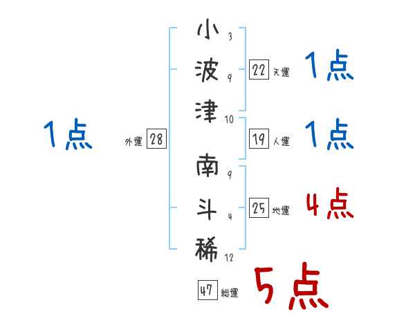 外運![]() | 小波津南斗稀さんの外運は28画の1つ星!家庭環境に注意。スポーツで活躍できる能力があるかも。 生活面を象徴する運勢です。外部から受ける影響力を表し、結婚運、家庭運や職場、環境への順応性を表します。 |