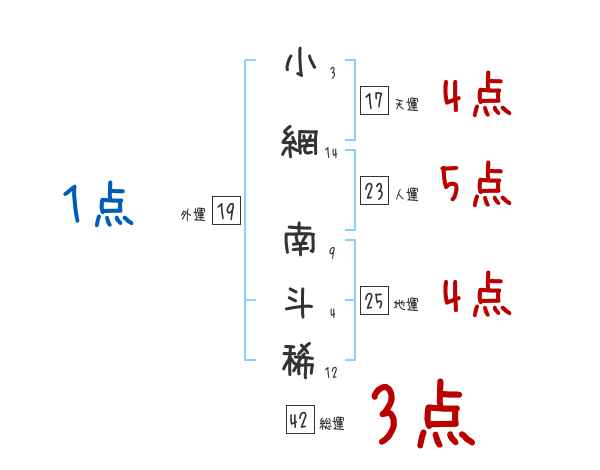 外運![]() | 小網南斗稀さんの外運は19画の1つ星!優れた才能を持ちますが、協調性が足りないことも。周りの人と協力する事を意識しましょう。 生活面を象徴する運勢です。外部から受ける影響力を表し、結婚運、家庭運や職場、環境への順応性を表します。 |