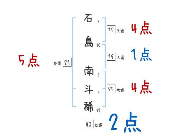 | 天運  | 石島南斗稀さんの天運は15画の4つ星!人徳があり出世する。順調に物事を進め円満な人生。家系が持つ宿命的な運勢を表します。祖先から受け継いだ苗字ですので自分の力が及びません。家柄を象徴します。 |