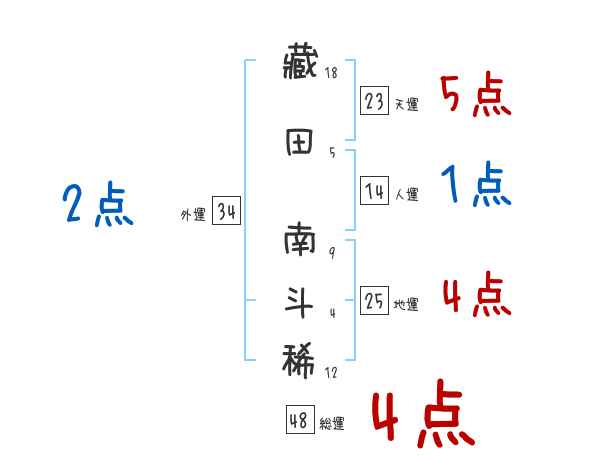 天運![]() | 藏田南斗稀さんの天運は23画の5つ星!想像力に優れ活力がある。一代で成功し名誉を手に入れる。 家系が持つ宿命的な運勢を表します。祖先から受け継いだ苗字ですので自分の力が及びません。家柄を象徴します。 |