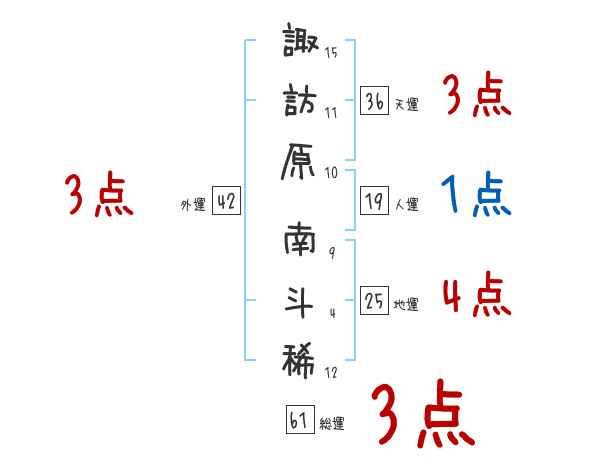 天運![]() | 諏訪原南斗稀さんの天運は36画の3つ星!先見性が豊かです。多少神経質で苦労することも。 家系が持つ宿命的な運勢を表します。祖先から受け継いだ苗字ですので自分の力が及びません。家柄を象徴します。 |
