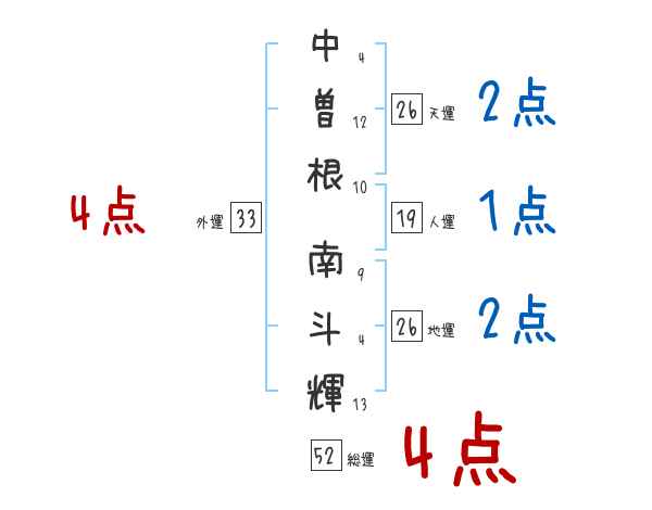外運![]() | 中曽根南斗輝さんの外運は33画の4つ星!権力志向でプライドが高い。勇気があり運を切り開き成功する。 生活面を象徴する運勢です。外部から受ける影響力を表し、結婚運、家庭運や職場、環境への順応性を表します。 |