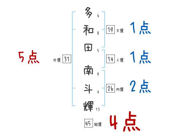 総運![]() | 多和田南斗輝さんの総運は45画の4つ星!もくもくと物事を進め達成する。地味な努力家。 あなたの人生を表す1番重要な運勢です。生涯を通じて影響する総合運となり、主に50歳以降の晩年期に影響を及ぼします。 |