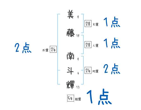 外運![]() | 美藤南斗輝さんの外運は26画の2つ星!波瀾万丈かも。信頼できる人を大事にしましょう。 生活面を象徴する運勢です。外部から受ける影響力を表し、結婚運、家庭運や職場、環境への順応性を表します。 |