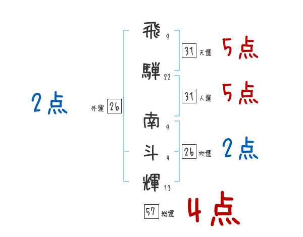 外運![]() | 飛騨南斗輝さんの外運は26画の2つ星!波瀾万丈かも。信頼できる人を大事にしましょう。 生活面を象徴する運勢です。外部から受ける影響力を表し、結婚運、家庭運や職場、環境への順応性を表します。 |