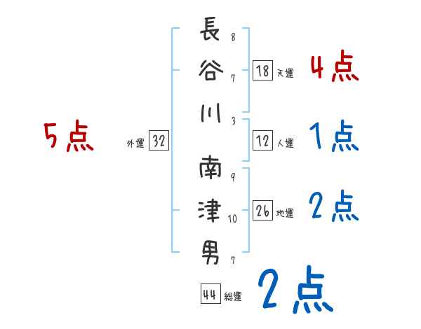 外運![]() | 長谷川南津男さんの外運は32画の5つ星!柔軟性があり成功する。チャンスが多く金運が良い。 生活面を象徴する運勢です。外部から受ける影響力を表し、結婚運、家庭運や職場、環境への順応性を表します。 |