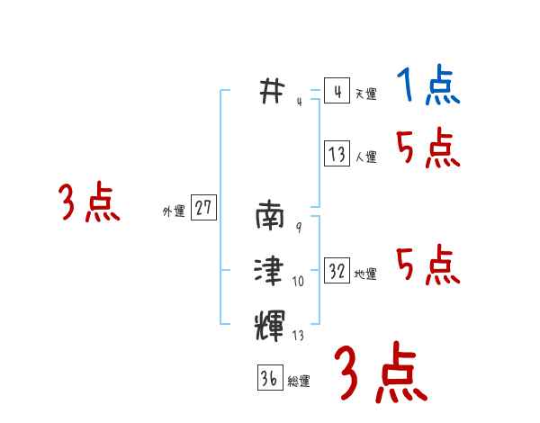 総運![]() | 井南津輝さんの総運は36画の3つ星!先見性が豊かです。多少神経質で苦労することも。 あなたの人生を表す1番重要な運勢です。生涯を通じて影響する総合運となり、主に50歳以降の晩年期に影響を及ぼします。 |