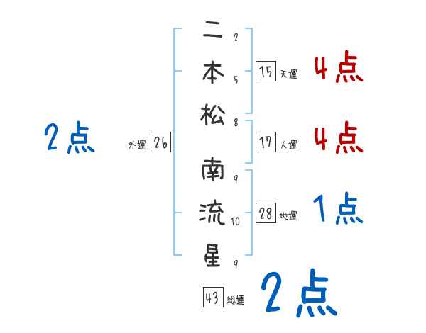 外運![]() | 二本松南流星さんの外運は26画の2つ星!波瀾万丈かも。信頼できる人を大事にしましょう。 生活面を象徴する運勢です。外部から受ける影響力を表し、結婚運、家庭運や職場、環境への順応性を表します。 |