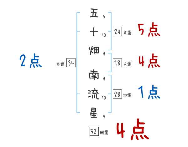 外運![]() | 五十畑南流星さんの外運は34画の2つ星!独創性に優れるが、自尊心が強く災難に注意しましょう。 生活面を象徴する運勢です。外部から受ける影響力を表し、結婚運、家庭運や職場、環境への順応性を表します。 |