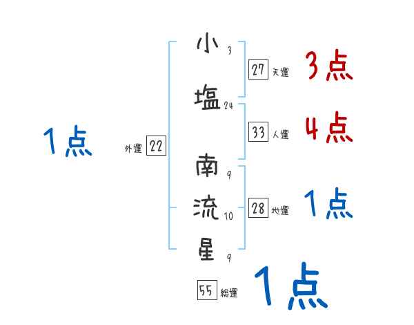 外運![]() | 小塩南流星さんの外運は22画の1つ星!努力することが苦手ないっぽう手先が器用。芸術性にも優れる。 生活面を象徴する運勢です。外部から受ける影響力を表し、結婚運、家庭運や職場、環境への順応性を表します。 |