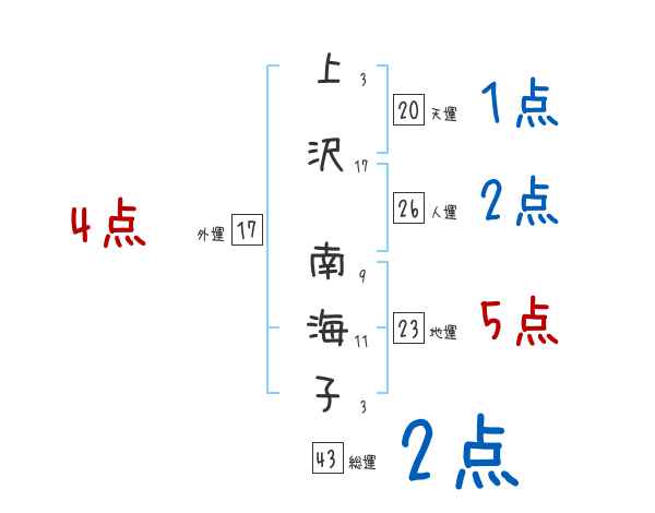外運![]() | 上沢南海子さんの外運は17画の4つ星!積極的な行動力。地位を気づき財産を手に入れる。純粋な心と直感力。 生活面を象徴する運勢です。外部から受ける影響力を表し、結婚運、家庭運や職場、環境への順応性を表します。 |