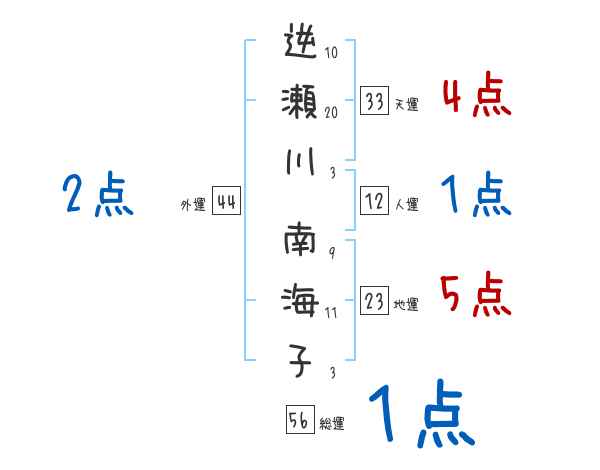 総運![]() | 逆瀬川南海子さんの総運は56画の1つ星!消極的で無気力になりがち。誠実な気持ちが必要でしょう。 あなたの人生を表す1番重要な運勢です。生涯を通じて影響する総合運となり、主に50歳以降の晩年期に影響を及ぼします。 |