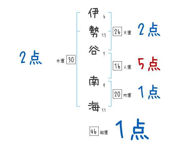 外運![]() | 伊勢谷南海さんの外運は30画の2つ星!浮き沈みの激しさに注意しましょう。 生活面を象徴する運勢です。外部から受ける影響力を表し、結婚運、家庭運や職場、環境への順応性を表します。 |