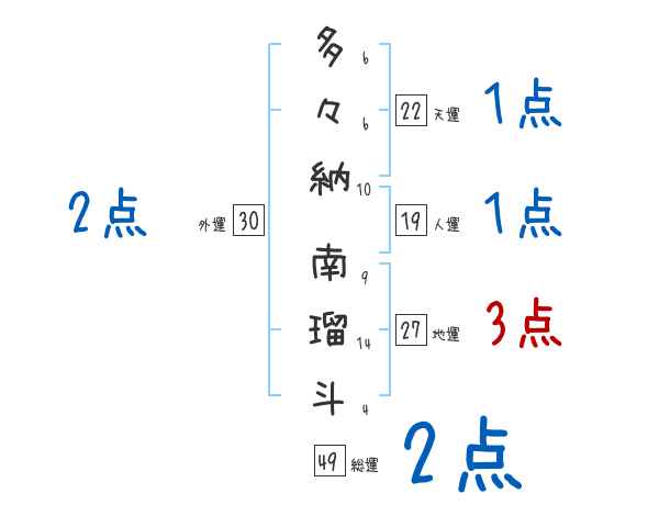 外運![]() | 多々納南瑠斗さんの外運は30画の2つ星!浮き沈みの激しさに注意しましょう。 生活面を象徴する運勢です。外部から受ける影響力を表し、結婚運、家庭運や職場、環境への順応性を表します。 |