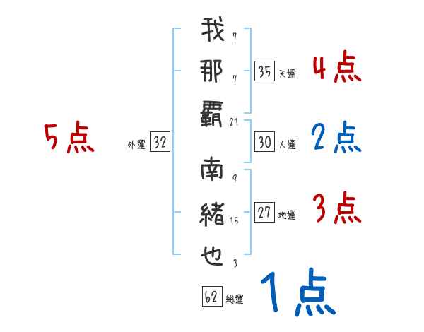 外運![]() | 我那覇南緒也さんの外運は32画の5つ星!柔軟性があり成功する。チャンスが多く金運が良い。 生活面を象徴する運勢です。外部から受ける影響力を表し、結婚運、家庭運や職場、環境への順応性を表します。 |