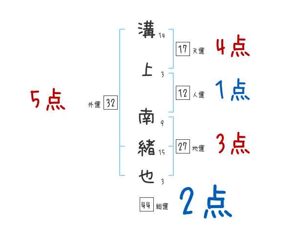 外運![]() | 溝上南緒也さんの外運は32画の5つ星!柔軟性があり成功する。チャンスが多く金運が良い。 生活面を象徴する運勢です。外部から受ける影響力を表し、結婚運、家庭運や職場、環境への順応性を表します。 |