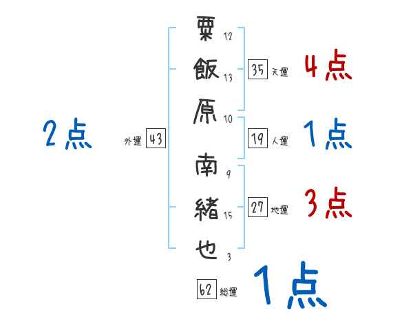 外運![]() | 粟飯原南緒也さんの外運は43画の2つ星!頑固な性格で独立心が強いかも。やや非現実的で浪費に注意しましょう。 生活面を象徴する運勢です。外部から受ける影響力を表し、結婚運、家庭運や職場、環境への順応性を表します。 |
