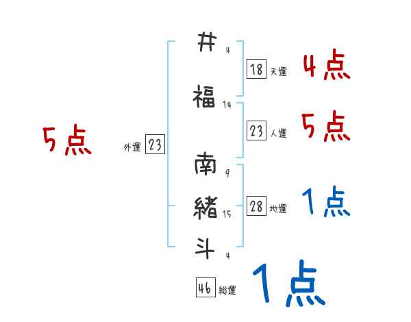 人運![]() | 井福南緒斗さんの人運は23画の5つ星!想像力に優れ活力がある。一代で成功し名誉を手に入れる。 性格や才能などを表す2番目に重要な運勢です。人間関係や協調性、社会的な成功に影響します。主に20歳から50歳ぐらいまでの中年期の運勢を表します。 |