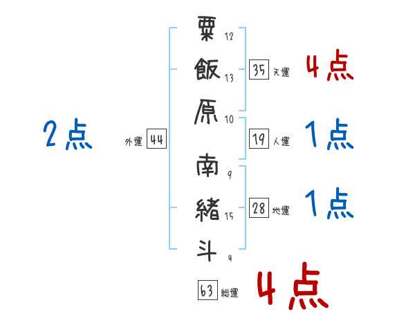 総運![]() | 粟飯原南緒斗さんの総運は63画の4つ星!家庭運がよく順調な生活。温和な性格。 あなたの人生を表す1番重要な運勢です。生涯を通じて影響する総合運となり、主に50歳以降の晩年期に影響を及ぼします。 |