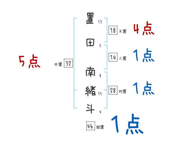 外運![]() | 置田南緒斗さんの外運は32画の5つ星!柔軟性があり成功する。チャンスが多く金運が良い。 生活面を象徴する運勢です。外部から受ける影響力を表し、結婚運、家庭運や職場、環境への順応性を表します。 |