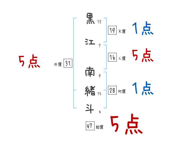 総運![]() | 黒江南緒斗さんの総運は47画の5つ星!実力が開花し発展する円満な人生。財に恵まれる。 あなたの人生を表す1番重要な運勢です。生涯を通じて影響する総合運となり、主に50歳以降の晩年期に影響を及ぼします。 |