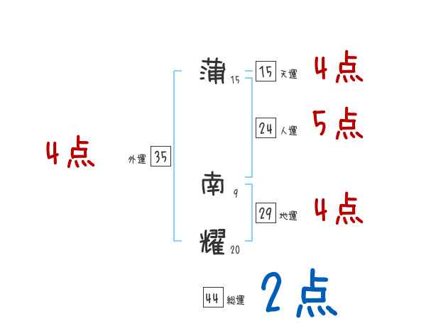 外運![]() | 蒲南耀さんの外運は35画の4つ星!温厚な性格で感受性が高い。穏和な性格で人望が厚い。 生活面を象徴する運勢です。外部から受ける影響力を表し、結婚運、家庭運や職場、環境への順応性を表します。 |