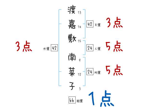 人運![]() | 渡嘉敷南菜子さんの人運は24画の5つ星!家庭運が良く順調な人生。金運にも恵まれる。 性格や才能などを表す2番目に重要な運勢です。人間関係や協調性、社会的な成功に影響します。主に20歳から50歳ぐらいまでの中年期の運勢を表します。 |