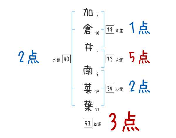 総運![]() | 加倉井南菜葉さんの総運は53画の3つ星!やや見栄っ張りで虚栄心がある。散財に注意。 あなたの人生を表す1番重要な運勢です。生涯を通じて影響する総合運となり、主に50歳以降の晩年期に影響を及ぼします。 |