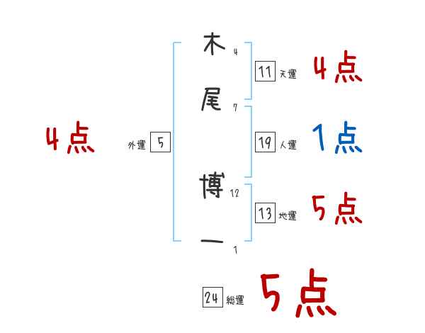 天運![]() | 木尾博一さんの天運は11画の4つ星!着実に富や地位を得る幸運な人生。 家系が持つ宿命的な運勢を表します。祖先から受け継いだ苗字ですので自分の力が及びません。家柄を象徴します。 |