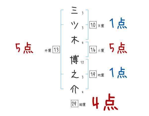 人運![]() | 三ツ木博之介さんの人運は16画の5つ星!人望が厚く大きく発展する。逆転成功が見える。 性格や才能などを表す2番目に重要な運勢です。人間関係や協調性、社会的な成功に影響します。主に20歳から50歳ぐらいまでの中年期の運勢を表します。 |