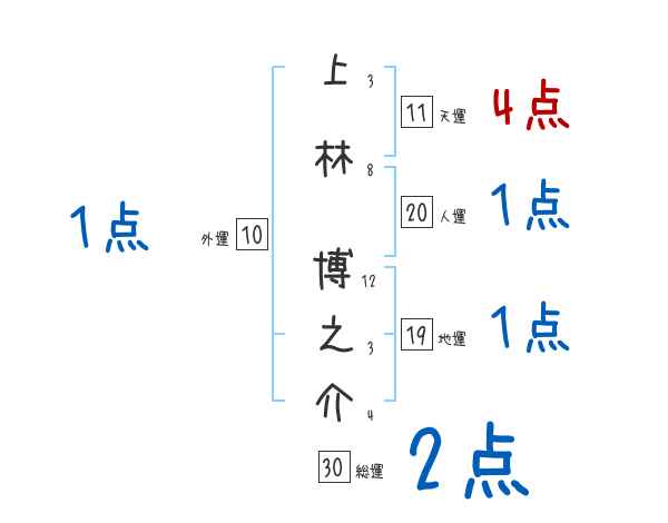 天運![]() | 上林博之介さんの天運は11画の4つ星!着実に富や地位を得る幸運な人生。 家系が持つ宿命的な運勢を表します。祖先から受け継いだ苗字ですので自分の力が及びません。家柄を象徴します。 |