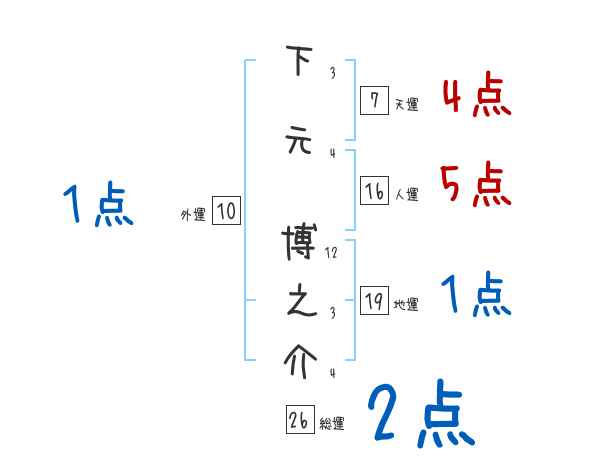 天運![]() | 下元博之介さんの天運は7画の4つ星!強い意志や信念を持ち独立心が強い。自立する。 家系が持つ宿命的な運勢を表します。祖先から受け継いだ苗字ですので自分の力が及びません。家柄を象徴します。 |