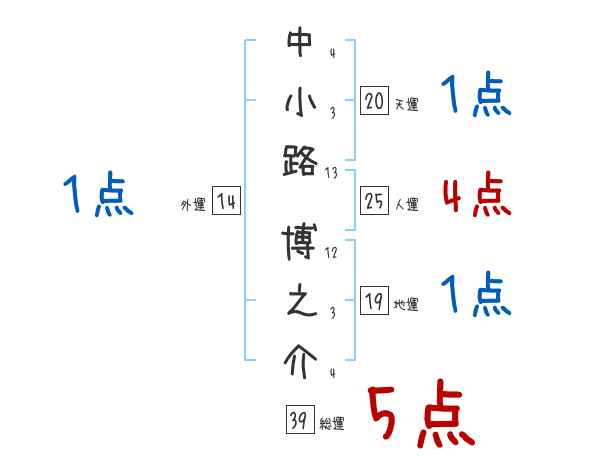 外運![]() | 中小路博之介さんの外運は14画の1つ星!人に対して優しいがストレスを溜め込みがち。人間関係のトラブルを避けるよう気をつけましょう。 生活面を象徴する運勢です。外部から受ける影響力を表し、結婚運、家庭運や職場、環境への順応性を表します。 |