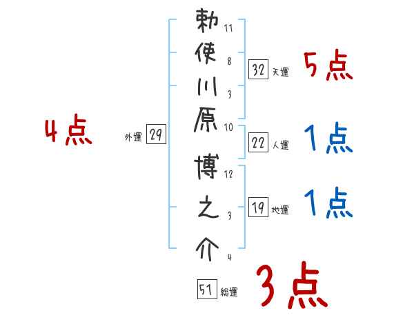 天運![]() | 勅使川原博之介さんの天運は32画の5つ星!柔軟性があり成功する。チャンスが多く金運が良い。 家系が持つ宿命的な運勢を表します。祖先から受け継いだ苗字ですので自分の力が及びません。家柄を象徴します。 |