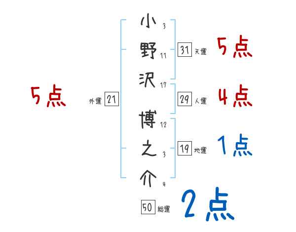 外運![]() | 小野沢博之介さんの外運は21画の5つ星!統率力がある。独立し成功する。名誉を手に入れる。 生活面を象徴する運勢です。外部から受ける影響力を表し、結婚運、家庭運や職場、環境への順応性を表します。 |