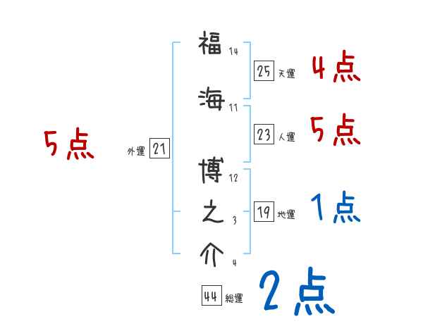 天運![]() | 福海博之介さんの天運は25画の4つ星!個性があり才能があふれる。強運の持ち主で発展する。 家系が持つ宿命的な運勢を表します。祖先から受け継いだ苗字ですので自分の力が及びません。家柄を象徴します。 |