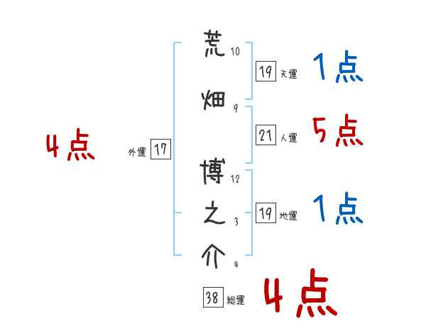 外運![]() | 荒畑博之介さんの外運は17画の4つ星!積極的な行動力。地位を気づき財産を手に入れる。純粋な心と直感力。 生活面を象徴する運勢です。外部から受ける影響力を表し、結婚運、家庭運や職場、環境への順応性を表します。 |