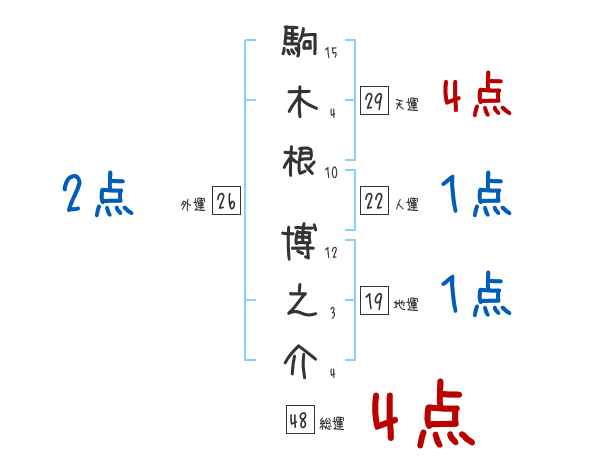 外運![]() | 駒木根博之介さんの外運は26画の2つ星!波瀾万丈かも。信頼できる人を大事にしましょう。 生活面を象徴する運勢です。外部から受ける影響力を表し、結婚運、家庭運や職場、環境への順応性を表します。 |