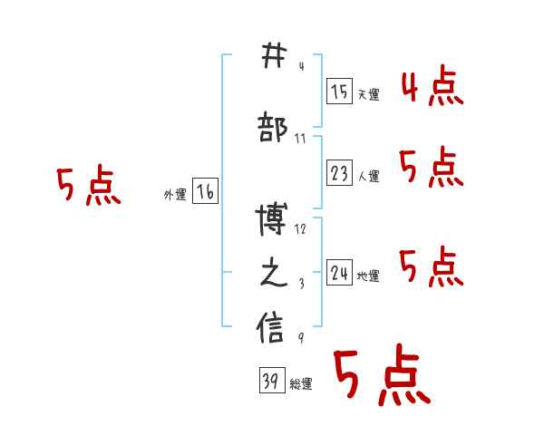 外運![]() | 井部博之信さんの外運は16画の5つ星!人望が厚く大きく発展する。逆転成功が見える。 生活面を象徴する運勢です。外部から受ける影響力を表し、結婚運、家庭運や職場、環境への順応性を表します。 |