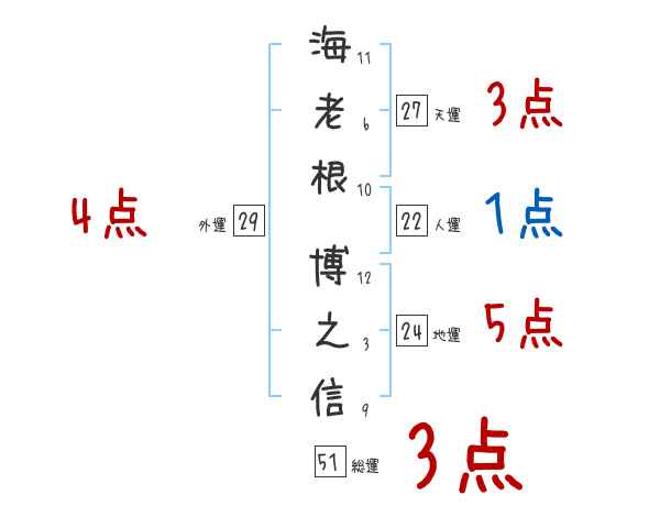 総運![]() | 海老根博之信さんの総運は51画の3つ星!変化が激しく、危険に注意。堅実な性格。 あなたの人生を表す1番重要な運勢です。生涯を通じて影響する総合運となり、主に50歳以降の晩年期に影響を及ぼします。 |