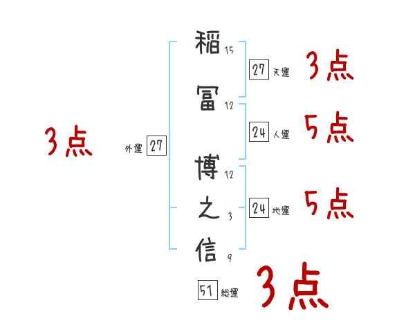 総運![]() | 稲冨博之信さんの総運は51画の3つ星!変化が激しく、危険に注意。堅実な性格。 あなたの人生を表す1番重要な運勢です。生涯を通じて影響する総合運となり、主に50歳以降の晩年期に影響を及ぼします。 |