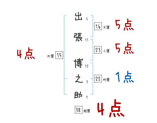 天運![]() | 出張博之助さんの天運は16画の5つ星!人望が厚く大きく発展する。逆転成功が見える。 家系が持つ宿命的な運勢を表します。祖先から受け継いだ苗字ですので自分の力が及びません。家柄を象徴します。 |