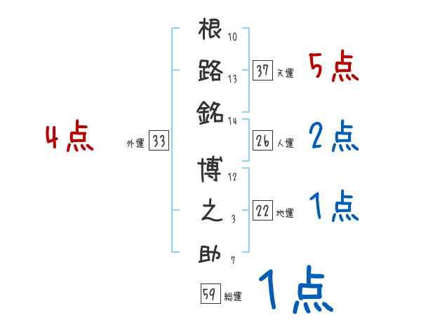 天運![]() | 根路銘博之助さんの天運は37画の5つ星!努力家で順応性に優れる。現実的な考え方ができ忠実に物事をこなす。 家系が持つ宿命的な運勢を表します。祖先から受け継いだ苗字ですので自分の力が及びません。家柄を象徴します。 |