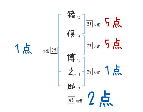 天運![]() | 猪俣博之助さんの天運は21画の5つ星!統率力がある。独立し成功する。名誉を手に入れる。 家系が持つ宿命的な運勢を表します。祖先から受け継いだ苗字ですので自分の力が及びません。家柄を象徴します。 |