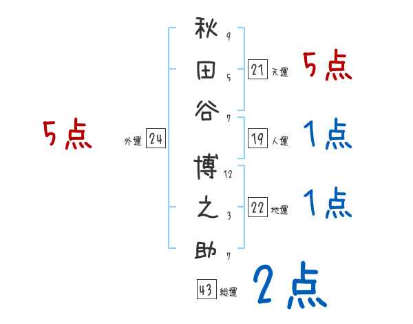 天運![]() | 秋田谷博之助さんの天運は21画の5つ星!統率力がある。独立し成功する。名誉を手に入れる。 家系が持つ宿命的な運勢を表します。祖先から受け継いだ苗字ですので自分の力が及びません。家柄を象徴します。 |