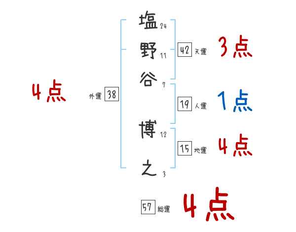 天運![]() | 塩野谷博之さんの天運は42画の3つ星!病気に注意。多芸であるが消極的でおとなしい。 家系が持つ宿命的な運勢を表します。祖先から受け継いだ苗字ですので自分の力が及びません。家柄を象徴します。 |
