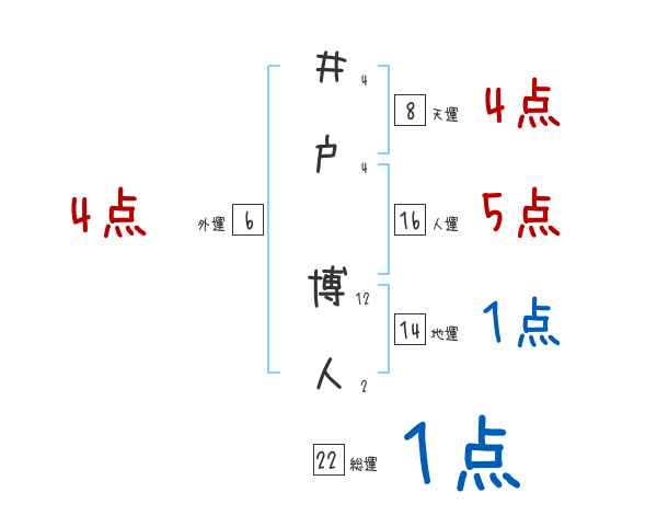 人運![]() | 井戸博人さんの人運は16画の5つ星!人望が厚く大きく発展する。逆転成功が見える。 性格や才能などを表す2番目に重要な運勢です。人間関係や協調性、社会的な成功に影響します。主に20歳から50歳ぐらいまでの中年期の運勢を表します。 |