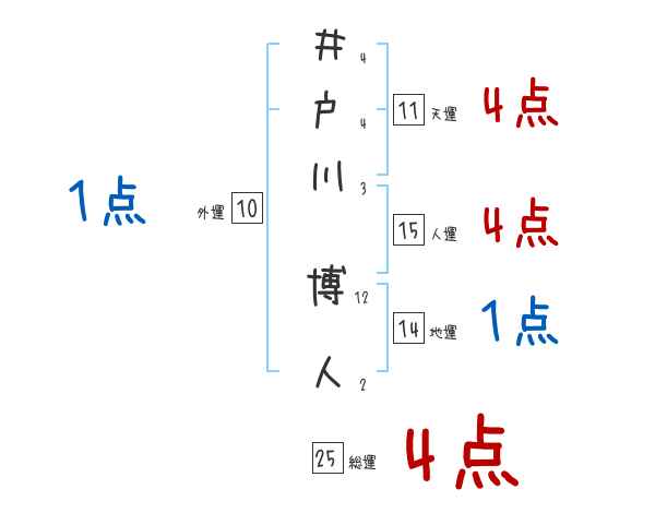 外運![]() | 井戸川博人さんの外運は10画の1つ星!不安を感じやすい傾向。ストレスを抱えないように注意しましょう。 生活面を象徴する運勢です。外部から受ける影響力を表し、結婚運、家庭運や職場、環境への順応性を表します。 |