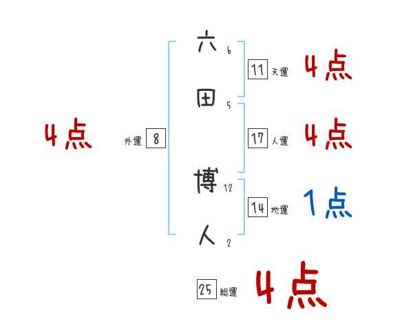 天運![]() | 六田博人さんの天運は11画の4つ星!着実に富や地位を得る幸運な人生。 家系が持つ宿命的な運勢を表します。祖先から受け継いだ苗字ですので自分の力が及びません。家柄を象徴します。 |